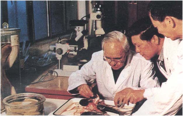 鐘麟是我國(guó)魚(yú)類繁殖專家。他主持的“四大家魚(yú)在池塘人工繁殖研究”獲得成功,榮獲全國(guó)科學(xué)大會(huì)獎(jiǎng)。圖為鐘麟(左一)在做實(shí)驗(yàn)。
