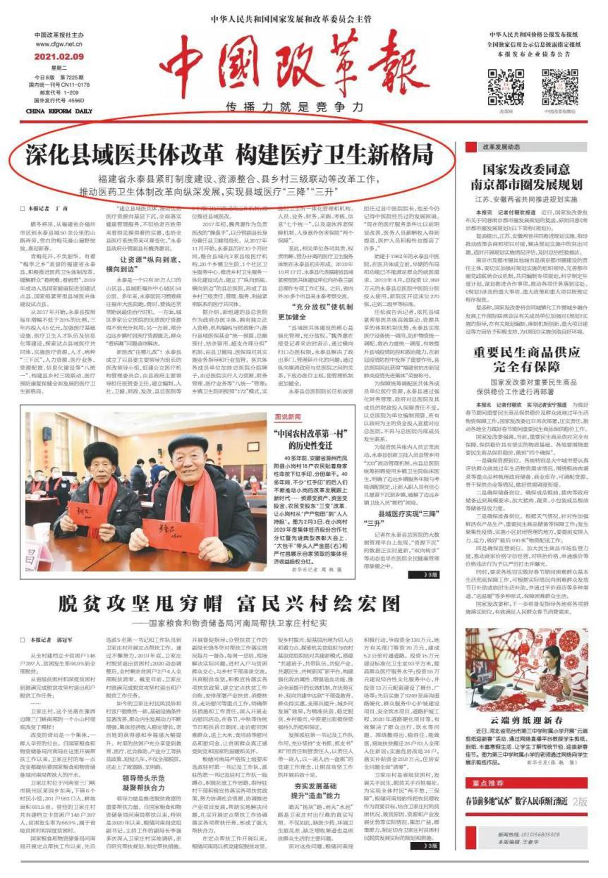2021年2月9日,《中國改革報》在頭版頭條以“深化縣域醫共體改革 構建醫療衛生新格局”為題報道了福州市永泰縣醫藥衛生體制改革的成效。永泰縣分管此項工作的副縣長正是九三學社社員魏秀惠。