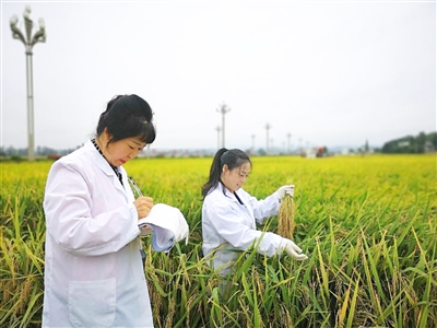 九三學社廣漢支社技術團隊成員在位于廣漢市連山鎮(zhèn)錦花村的酵素水稻收割現(xiàn)場進行記錄。